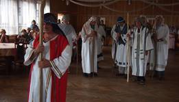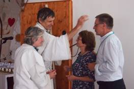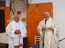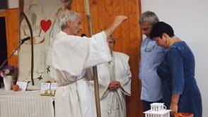 Na slávnostnej svätej omši sme si obnovili manželský sľub. Don Marián v homílii povedal: „Tento sviatostný dom rodiny vďaka pôsobeniu Ducha v sebe vytvára sviatostný charakter, kde je prítomný Kristus. A tak „sme Kristovou ľúbeznou vôňou pre Boha uprostred tých, čo sú na ceste spásy, i tých, čo idú do záhuby. Jedným vôňou smrti na smrť, druhým vôňou života pre život.“ (2.Kor. 2, 15-16). „Oni (manželia) nielen bývajú v jednom dome, ale sa aj usilujú o spoločný domov a vytvárajú ho tým, že „bývajú“ každý v srdci toho druhého ...“. Slávnostne naladení sme sa spievajúc pomaly presunuli do jedálne. V čele sprievodu išli oblečení patriarchovia. Pred slávnostnou večerou sa uskutočnil symbolický obrad odovzdávania vedenia kurzu od Janka a Aničky Rajských k Lackovi a Majke Baránkovcov za asistencie donov Mariána a Jozefa.
